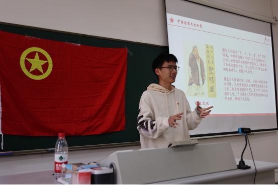 接下来,国实2101班的朱奕昊、朱彧贤、陈涵三位同学分别作为团员和青年代表,向大家展示了自己对于中华文化的认识。同学们从优秀传统文化、优秀民族文化、优秀红色文化三个方面展开,为大家介绍了源远流长、博大精深的中华文化。