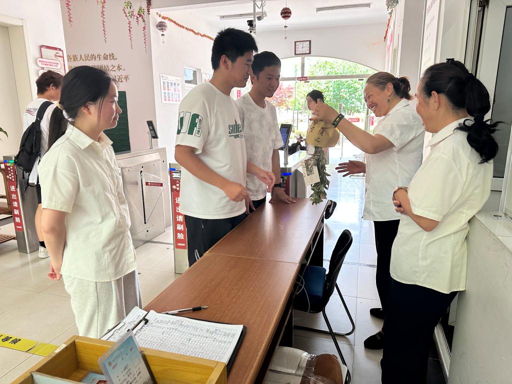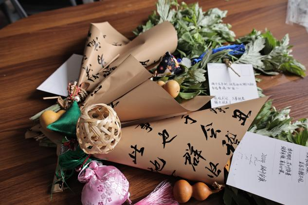 佩戴香包是端午节的传统习俗之一,既有驱邪避瘟之意,也有襟头点缀之风。同学们创新形式,两两一组,制作倒挂艾草花束。以艾草打底,添上香囊、葫芦等配饰,裹上牛皮纸,系上五彩绳,附上”悠悠艾草香、绵绵情义长“等祝福语,一份艾草花束就完成了。同学们三四人结伴而行,送出了制作精美的艾草挂件。值班室、宿管站、教师办公室的大门前都挂上了艾草花束,营造了浓厚的节日氛围。