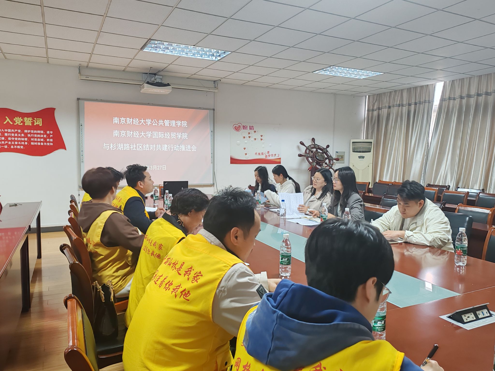 3月27日,南京财经大学国际经贸学院、公共管理学院与杉湖路社区结对共建行动推进会在德济楼508会议室顺利召开。国际经贸学院团委书记邓盛佳、公共管理学院团委书记于华、杉湖路社区书记曹啸出席,十余名社区网格员、志愿者,学院志愿服务项目负责学生参会。院社双方围绕社区资源整合、志愿服务创新及传统节日活动等议题展开深入交流,共同探索校社合作新模式,助力基层治理与社区服务提质增效。