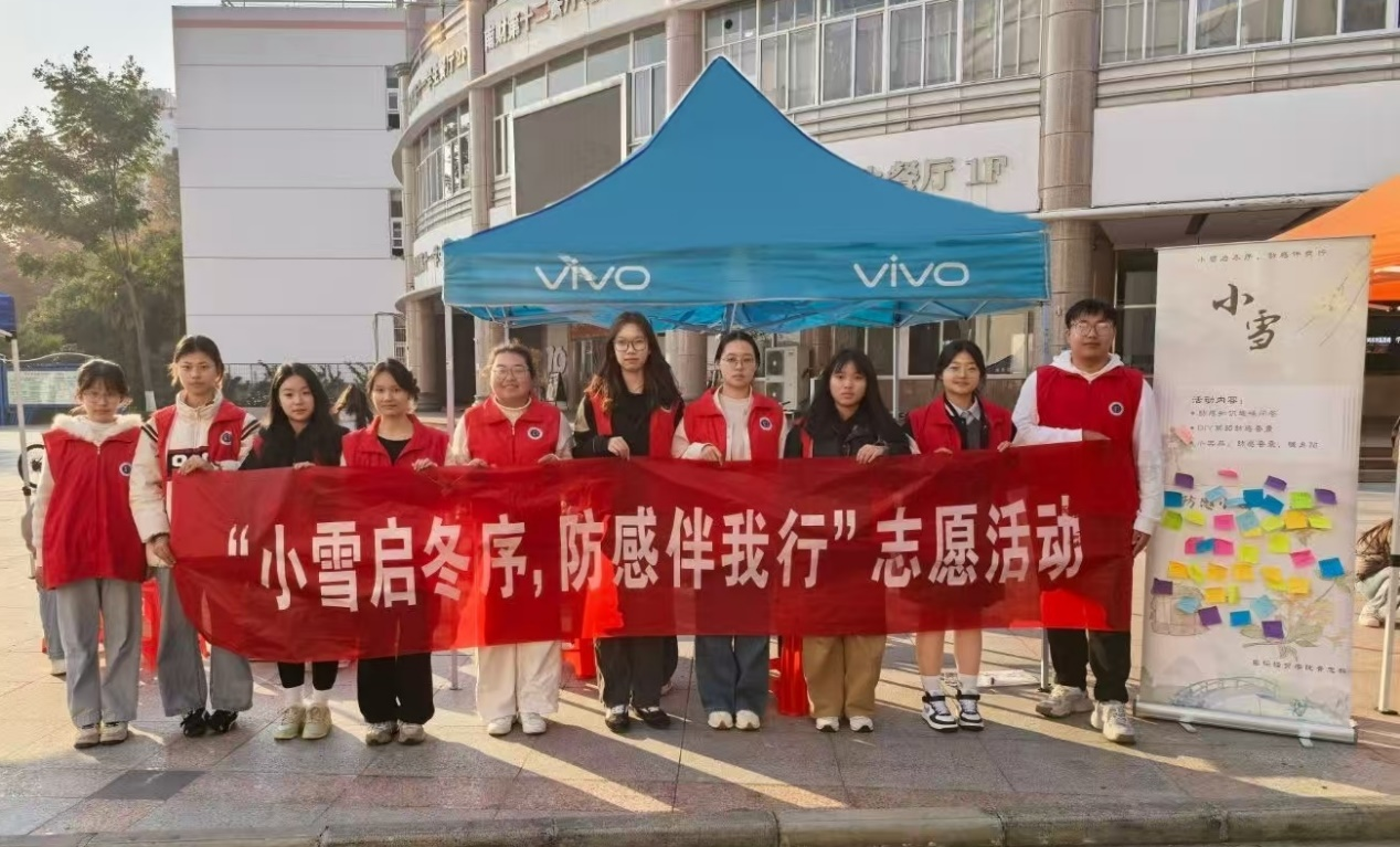 寒律初凝小雪临,冬藏颐养顺时深。11月21日,国际经贸学院志愿者们在中苑食堂门口举办了“小雪启冬序,防感伴我行”小雪预防感冒志愿活动,志愿者们以热情服务与贴心互动,将小雪节气传统与冬季防感知识相融,为冬日校园添上浓厚的温暖底色。