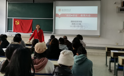 为响应学校学院考风考纪教育动员会活动,增强学生对诚信考试的重视,进一步加强同学们的考风考纪,构建安全诚信校园,保证期末考试的顺利进行,倡导同学们“端正考风、严肃考纪、文明答题、诚信应考”。国际经贸学院开展了系列诚信教育主题班会。
