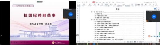 在上午讲座中,茆老师首先为同学们分析了当前经济形式带来的就业难度,尤其是在疫情情况下的就业局面。接着给同学们详细解析校园招聘事宜。校园招聘按照时间顺序大致由秋招提前批(内推),暑假实习招聘,秋招,冬季补录(研后专场),寒假实习招聘和春招等批次构成。其中秋招面向的人群是即将毕业的应届生。接着给同学们介绍了秋招需要做的准备,分别从确定求职方向、 针对性地制作简历、准备心仪公司的笔试和面试、秋招全流程解析等方面去分析,重点讲解了银行类的校园招聘。