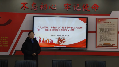 国际经贸学院研究生党支部副书记张东霞老师为此次活动的获奖同学颁奖,她希望广大同学要齐心协力把校园建设成各民族学生的精神家园,让中华民族共同体意识在潜移默化中生根发芽,进一步坚定为党和国家贡献青春力量的信心和决心。