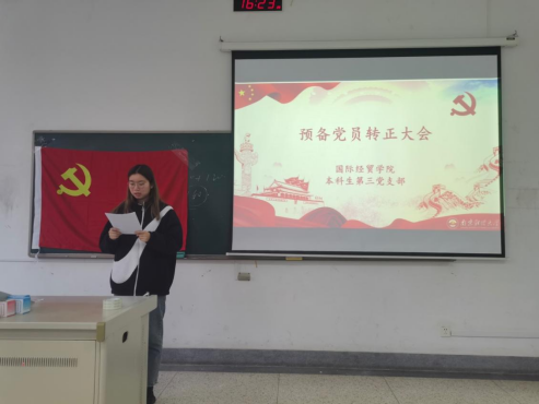 2021年12月11日下午,国际经贸学院本科生第三党支部在德经楼Z1-110教室召开了预备党员转正大会,讨论预备党员俞天悦转为中共正式党员的事宜。出席此次会议的有本支部全体党员,政治辅导员季霞老师出席并指导工作。