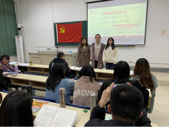 2021年12月11日,南京财经大学国际经贸学院本科生第一党支部在在德经楼108教室召开预备党员转正支部大会,讨论本支部汪子欣、赵利、吴川丽3名预备党员按期转正事宜,支部大会由本科生第一党支部书记孙绪华主持,支部大会应到党员48人,实到党员48人,其中有表决权的正式党员8人,实到正式党员8人。