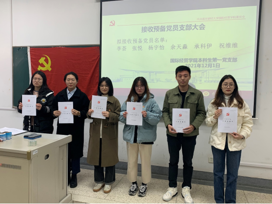 2021年12月1日,南京财经大学国际经贸学院本科生第一党支部在德经楼108教室召开党员支部大会,讨论接收李荟等6名发展对象为预备党员事宜,支部大会由本科生第一党支部书记孙绪华主持,政治辅导员张阳军书记全程参与大会并指导工作。支部大会应到党员42人,实到党员42人,其中有表决权的正式党员8人,实到正式党员8人。