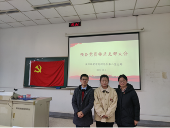 2021年12月1日下午15:00,国际经贸学院研究生第二党支部在德经楼106教室召开了预备党员转正支部大会,会议议题为讨论徐雅琪同志按期转为中共正式党员事宜。本次会议由党支部副书记张东霞老师主持,党支部书记李贲老师、支部全体党员出席了此次会议。