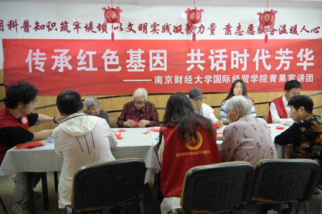 面对王子楼社区颐养中心的老人们,宣讲团延续社区老年大学的传统,为老人们带来红色宣讲和剪纸活动。战争年代的兵荒马乱、中华人民共和国成立初期的百废待兴、改革开放的时代浪潮......活动中,宣讲团成员一边与老人们剪纸,一边听老人们讲述时代的变迁。老少间的交谈让宣讲团成员们更直观真切的感受到如今幸福生活的来之不易,进一步坚定理想信念,厚植爱国主义精神。