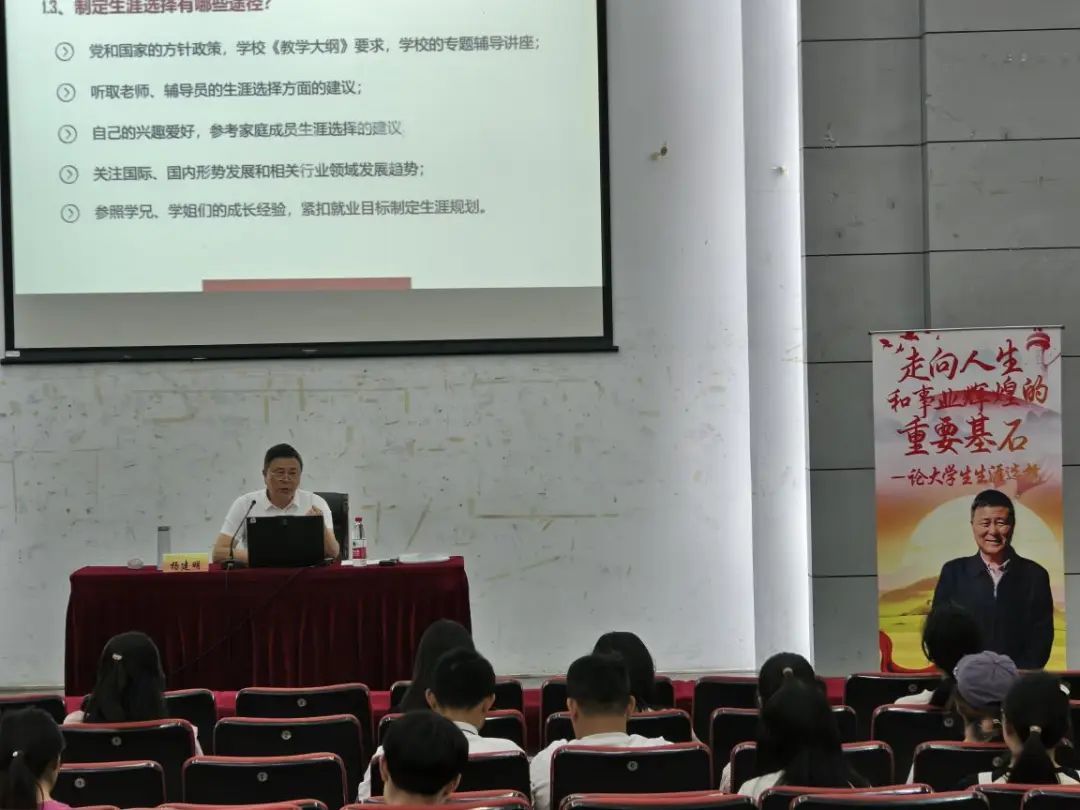 “生涯选择是个人结合自身与环境,确立目标、规划路径的主动行为。”讲座伊始,杨建明老师提出“入学即需启动生涯思考”,指出生涯规划的逻辑起点是基于学校平台、学业成绩、奖项含金量、意志力与情商的“四理性认识”,“就像照镜子,只有看清自身长短板,才能避免好高骛远或妄自菲薄。”他援引“某生因未通过英语考试错失公务员岗位”的真实案例,警示基础能力的重要性,引发学子对“早规划、早行动”的深刻共鸣。
