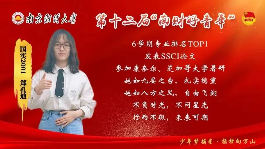 迪风扬帆海天阔,春色满园花自开。国际经贸学院优秀学子国实2001郑孔迪身体力行。连续6学期获“学习优秀奖学金”一等奖,荣获国家奖学金、及江苏省优秀学生干部、“瑞华杯”大学生年度人物和“双创之星”等荣誉称号。同时担任校团委科创实践部部长、大学生科学技术协会主席,多次荣获优大、优干、优团干和优共等荣誉奖项。此外累计在SSCIFrontiers、ICFET2022、《全国流通经济》和《办公自动化》发表4篇学术论文,拥有4项在申发明专利和2项软件著作权。担任国家级大创主持人并优秀结项,荣获“互联网+”省、学创杯省特、三创赛省三和海峡两岸女大学生创新创业大赛金奖等。参与康奈尔大学CICER和芝加哥大学DPSS暑期科研项目,并以优秀成绩结业。履历之优秀程度,令人赞叹不已。